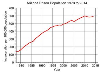 | Keywords: Arizona Prison Population.svg en Arizona prison incarceration rate per 100 000 population from 1978 to 2014 Data from http //www bjs gov/index cfm ty nps BJS 2016-04-30 own Delphi234 other versions current annually Generated with Wikimedia SVG Chart SVG Chart/box cc-zero Prisons in Arizona Imprisonment and detention rates in the United States |