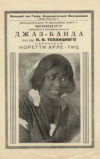 Keywords: Arle-tiz.jpg en The poster of concert of First Concert Jazz-Band directed by Leopold Teplitsky with participation of singer Coretti Arle-Tiz Leningrad 1927 December 11 http //archives karelia ru/nark/projects/mosaic/viewimg phtml lng id 2727 pageid 3076 Author 1927 anonymous work PD-old Concert posters of Russia 11 December Music in 1927 Jazz vocalists Music of Russia History of Saint Petersburg 1920s posters |
