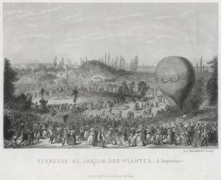 | Keywords: Armand-Joseph Lallemand, Kermesse au jardin des plantes (8 septembre), ca. 1850-70 n2.jpg Print shows a woman in the basket of an inflated balloon on the ground at right ready for ascent and a crowd in the foreground gathered to celebrate a September fair in the Royal Gardens Paris France between 1850 1870 1 print engraving object history exhibition history credit line accession number LOC-image ppmsca 02628 PD-Old Historical images of the Jardin des Plantes de Paris Engravings of Paris Hot air balloons in Paris Kermesses Images of Paris from the Library of Congress |