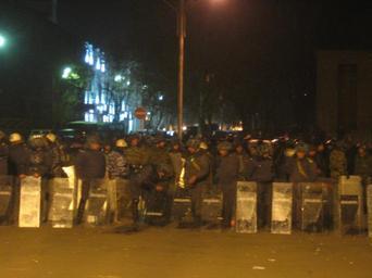 | Keywords: Armenian Presidential Elections 2008 Protest Day 11 - 1205AM Shahumyan Square Police frontline closeup.jpg The 11th day of Armenian presidential election protests At 7 30 am the peaceful camp-in protest at Liberty Square in Yerevan was violently ended by Armenian special forces which used truncheons and electric shock devices to disperse the crowd of around 1 000 At 12 30 pm a new crowd marches to the French Embassy in a spontaneous demonstration barricade themselves using abandoned police buses and grow in number to around 150 000 By 12 am about 2 000 demonstrators are left barricaded <br/><br/>In this picture 12 am 2 rows of riot police followed by a row of special forces guard Shahumian Square Meanwhile tens of demonstrators which opposition leaders say are led by provocateurs loot a grocery store and break windows a kilometer away Own 2008-03-02 Serouj 40 10 33 06 N 44 30 31 18 E Demonstrations and protests relating to the Armenian presidential elections 2008 |