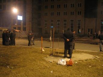 | Keywords: Armenian Presidential Elections 2008 Protest Day 11 - 1226AM Miasnikyan Square - braveheart scene - protestor ready for battle.jpg The 11th day of Armenian presidential election protests At 7 30 am the peaceful camp-in protest at Liberty Square in Yerevan was violently ended by Armenian special forces which used truncheons and electric shock devices to disperse the crowd of around 1 000 At 12 30 pm a new crowd marches to the French Embassy in a spontaneous demonstration barricade themselves using abandoned police buses and grow in number to around 150 000 By 12 am about 2 000 demonstrators are left barricaded The bulk of the approximately 2 000 demonstrators left in the area are at Miasnikyan Square in front of the French Embassy while only tens of people are at the site of the looting of a grocery store near the intersection of Mashdots Ave and G Lusavorich Street a quarter mile northwest of the location of this camera The nearest police are stationed at Shahuman Square 1/3 of a kilometer northeast of the location of this camera Police allow looting to continue in the area of Mashdots Ave and G Lusavorich for several hours as government TV crews film tens of people looting the grocery store <br/><br/>In this picture 12 26AM View south-south-east like a scene from a modern-day Braveheart a protester has planted his primitive swords long metal rods into the ground as a modern army of riot police special forces and army prepares for battle less than 1km to the northeast Own 2008-03-02 Serouj 40 10 26 85 N 44 30 17 69 E Demonstrations and protests relating to the Armenian presidential elections 2008 Braveheart |