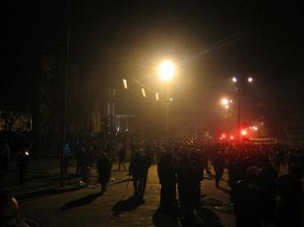 | Keywords: Armenian Presidential Elections 2008 Protest Day 11 - 1238AM Miasnikyan Square - general view.jpg The 11th day of Armenian presidential election protests At 7 30 am the peaceful camp-in protest at Liberty Square in Yerevan was violently ended by Armenian special forces which used truncheons and electric shock devices to disperse the crowd of around 1 000 At 12 30 pm a new crowd marches to the French Embassy in a spontaneous demonstration barricade themselves using abandoned police buses and grow in number to around 150 000 By 12 am the bulk of the approximately 2 000 demonstrators left in the area are at Miasnikyan Square in front of the French Embassy while only tens of people are at the site of the looting of a grocery store near the intersection of Mashdots Ave and G Lusavorich Street a quarter mile northwest of the location of this camera The nearest police are stationed at Shahuman Square 1/3 of a kilometer northeast of the location of this camera Police allow looting to continue in the area of Mashdots Ave and G Lusavorich for several hours as government TV crews film tens of people looting the grocery store <br/><br/>In this picture 12 38 AM general view of Miasnikyan Square viewed south-east Statue in center-left Own 2008-03-02 Serouj 40 10 29 99 N 44 30 20 42 E Demonstrations and protests relating to the Armenian presidential elections 2008 |
