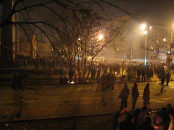 | Keywords: Armenian Presidential Elections 2008 Protest Day 11 - 1240AM Miasnikyan Square - top view.jpg The 11th day of Armenian presidential election protests At 7 30 am the peaceful camp-in protest at Liberty Square in Yerevan was violently ended by Armenian special forces which used truncheons and electric shock devices to disperse the crowd of around 1 000 At 12 30 pm a new crowd marches to the French Embassy in a spontaneous demonstration barricade themselves using abandoned police buses and grow in number to around 150 000 By 12 am the bulk of the approximately 2 000 demonstrators left in the area are at Miasnikyan Square in front of the French Embassy while only tens of people are at the site of the looting of a grocery store near the intersection of Mashdots Ave and G Lusavorich Street a quarter mile northwest of the location of this camera The nearest police are stationed at Shahuman Square 1/3 of a kilometer northeast of the location of this camera Police allow looting to continue in the area of Mashdots Ave and G Lusavorich for several hours as government TV crews film tens of people looting the grocery store <br/><br/>In this picture 12 41 AM the heart of the demonstration at Miasnikyan Square The platform where organizers speak using loudspeakers is in front of statue Groups of peaceful demonstrators huddle around campfires to stay warm Own 2008-03-02 Serouj 40 10 29 99 N 44 30 20 42 E Demonstrations and protests relating to the Armenian presidential elections 2008 Statues in Yerevan |