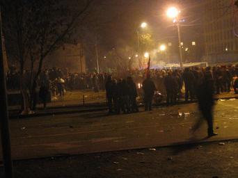 | Keywords: Armenian Presidential Elections 2008 Protest Day 11 - 1243AM Miasnikyan Square - crowd closeup.jpg The 11th day of Armenian presidential election protests At 7 30 am the peaceful camp-in protest at Liberty Square in Yerevan was violently ended by Armenian special forces which used truncheons and electric shock devices to disperse the crowd of around 1 000 At 12 30 pm a new crowd marches to the French Embassy in a spontaneous demonstration barricade themselves using abandoned police buses and grow in number to around 150 000 By 12 am the bulk of the approximately 2 000 demonstrators left in the area are at Miasnikyan Square in front of the French Embassy while only tens of people are at the site of the looting of a grocery store near the intersection of Mashdots Ave and G Lusavorich Street a quarter mile northwest of the location of this camera The nearest police are stationed at Shahuman Square 1/3 of a kilometer northeast of the location of this camera Police allow looting to continue in the area of Mashdots Ave and G Lusavorich for several hours as government TV crews film tens of people looting the grocery store <br/><br/>In this picture 12 43 AM the heart of the demonstration at Miasnikyan Square - crowd closeup The banner on the bus in the background originally read We will win «Մենք յաղթելու ենք» and was edited by the people to read We have one «Մենք յաղթել ենք» Own 2008-03-02 Serouj 40 10 29 99 N 44 30 20 42 E Demonstrations and protests relating to the Armenian presidential elections 2008 |