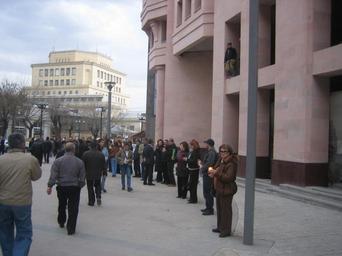 | Keywords: Armenian Presidential Elections 2008 Protest Mar 21 - Northern Ave candles.jpg The first day after the 20-day state of emergency had been lifted after the Armenian presidential election protests Between 5pm and 7pm about 1 000 citizens -- mostly women -- participated in a peaceful and silent protest and vigil to remember those who died on March 1 condemn the government's actions and to recognize the more than 100 political prisoners <br/><br/>In this picture 5 46 pm on Northern Avenue near Abovyan St a group of citizens hold candles to remember those killed by authorities on the night of March 1 a protest which was in response to the government's violent breakup of the 10-day sit-in protest at Liberty Square Own 2008-03-21 Serouj 40 10 48 78 N 44 30 51 95 E Demonstrations and protests relating to the Armenian presidential elections 2008 Candles in Armenia |