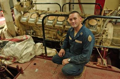 | Keywords: Army Sailors Repair Dry Dock Ship DVIDS33646.jpg en Sgt John Wilkey a watercraft engineer from Paradise California kneels inside one of the engine rooms next to one of the engines under work to get the ship back in the water to support vital missions and units along the Persian gulf 2006-11-30 1st Lt Ryan Pace https //www dvidshub net/image/33646 33646 2006-11-30 09 41 CAMP ARIFJAN KW PD-USGov Camp Arifjan Images from DoD uploaded by Fæ | ||||