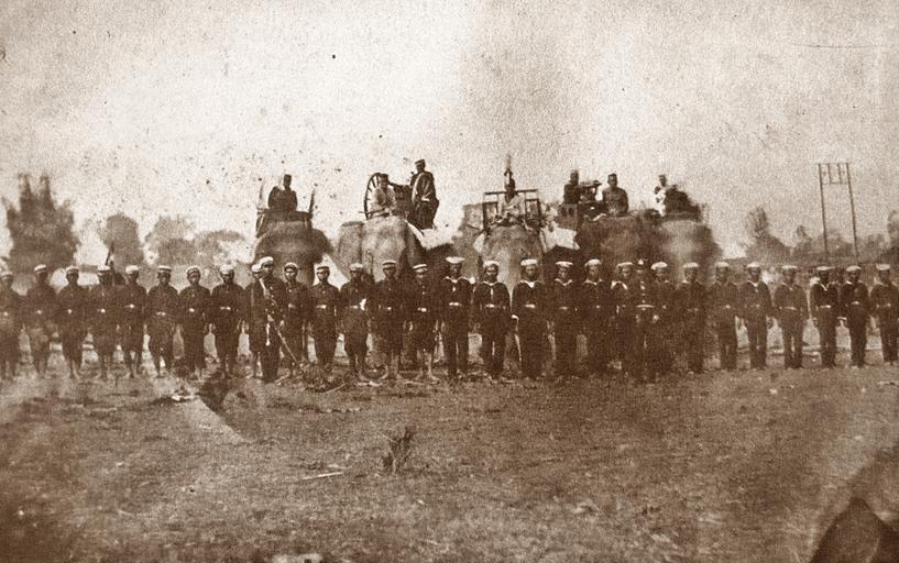 Keywords: Army of Thailand in Haw wars (1875).jpg ภาพช้างบรรทุกปืนใหญ่ของกำลังไพร่พล กณฑ์มณฑลพิษณุโลก กำลังจะ ดินกระบวนไปปราบฮ่อธง หลือง ณ หลวงพระบาง ป็นครั้งแรกใน พ ศ 2418 ภาพจากสมุดภาพรัตนโกสินทร์ Haw wars Source 1875 PD-art Army of Thailand
