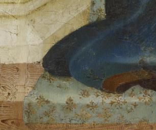 | Keywords: Arnau Bassa - Triptych with Madonna and Child with the Crucifixion and the Annunciation - Walters 37468 - A T Detail O.jpg Circle of The central scene of this altarpiece depicts the enthroned Madonna and Child flanked by angels The Christ Child holds a tiny European goldfinch a symbol of his resurrection The bird is tethered a reminder that in the 14th century such animals were kept as pets by children Angels present Mary with chalices of white flowers alluding to her purity On the left appear the Annunciation and the Crucifixion while Christ's Presentation in the Temple and the Coronation of the Virgin are on the right The delicate punch-work decoration and the slender graceful figures reveal the influence of Sienese painting Catalan artists learned the style and techniques of Italian painting by examining imported Italian works in local churches; some even traveled to Italy to perfect their craft ca 1340 1348 Medieval tempera and gold leaf on panel cm 126 8 184 9 accession number 37 468 1582 Henry Walters Baltimore 1931 mode of acquisition unknown Walters Art Museum Henry Walters Acquired by Henry Walters 1931 The International Style The Arts in Europe Around 1400 The Walters Art Gallery Baltimore 1962 place of origin Catalonia Spain Walters Art Museum license 2D Triptych with Madonna and Child with the Crucifixion and the Annunciation Media contributed by the Walters Art Museum needs category review |