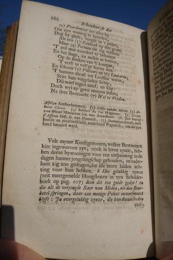 | Keywords: Arnold Houbraken VII p 360.JPG en Copy of Arnold Houbraken's Schouburg from 1719 published and sold by the author nl 2 Voordewind zet alles by Om zyn woning te bezeilen Dog hy ploft vergist in 't peilen Als een 3 Zantzak op den grond Maar 4 Fortuin die zig verstond 'T zeil met voordeel te beheeren En het lings en rechts te keeren Op de streken van 't kompas 'T eerst in veil'ge haven was En schoon 5 Piktoors en 6 Lantaren 'T hunnen dienst tot Leidstar waren Stiet hun volgeladen Schip Dikwerf tegen zand en klip Dog wyl zy geen rampen leden Na dees Benttogt 7 Wel te Vreden Vele myner Konstgenooten welker Bentnamen hier ingeweeven zyn nog in leven zynde hebben deeze bywoningen voor een uitspanning in de dagen hunner jongelingschap gehouden en naderhand zig zoo gedragen dat alle brave luiden agting voor hun hebben รด Hoe gelukkig zynze zeit meergemelde Hoogstraten in zyn Schilderboek op pag 207 dien dit ten goede gedyt en die als de verjongde Ram van Medea uit den Bentketel springen daar zoo menige Pelias in versmoort blyft Ja overgelukkig zynze die hun dwaasheden 2 Gillis vander Meren 3 Alberto Clovet 4 Robbert du Val Hagenaar 5 Kasper van Wittel Miniatuur sch van Amesfoort 6 Jan Baptist d'Assenie Hist sch van Doornik 7 Dominicus Schaft eerst beelde en pourtretschild naderhand Wayersch ; om dat zyn hand beroerd werd 2015-04-23 18 16 11 own PD-old-100 Jane023 other versions cc-0 Schouburg II Uploaded with UploadWizard Bentvueghels |
