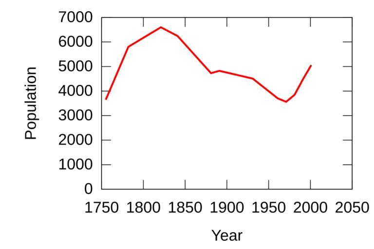 | Keywords: Arran population.svg The population of the Isle of Arran over time Generated using Gnuplot - see commands below own 2011-05-01 Mike Peel Source code File 'population dat' containing - <pre>1755 3646 1782 5804 1821 6600 1841 6241 1881 4730 1891 4824 1931 4506 1961 3700 1971 3564 1981 3845 1991 4474 2001 5058 </pre> Plot commands - <pre>set terminal svg size 600 400 font 'Arial' fsize 20 set output 'arran_population svg' set yrange 0 set key off set ylabel 'Population' set xlabel 'Year' plot 'population dat' u 1 2 w l lw 3 </pre> Cc-zero Isle of Arran |