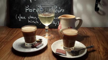 Keywords: arrangement coffee wine glass krug espresso slate french