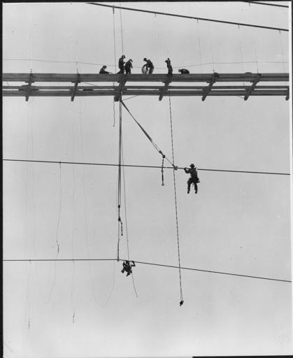| Keywords: Arranging wind bracing for suspension bridge - NARA - 294022.jpg Scope and content Photograph from Volume Two of a series of photo albums documenting the construction of the Grand Coulee Dam and related work on the Columbia Basin Project General notes 294022 Local identifier Department of the Interior Bureau of Reclamation Engineering and Research Center 05/18/1981 - 03/04/1988 NARA's Rocky Mountain Region Denver NRGA Building 48 Denver Federal Center West 6th Avenue and Kipling Street Denver CO 80225-0307 1935-09 Record group Record Group 115 Records of the Bureau of Reclamation 1889 - 2008 Record group ARC 444 Photograph albums compiled 1903 - 1972 Series ARC 293611 File unit File unit ARC Variant control numbers NAIL Control Number NRG-115-CONSTPHO85006-COLBASIN2729 Other versions <gallery> File Arranging wind bracing for suspension bridge - NARA - 294022 tif tif </gallery> NARA-cooperation PD-USGov Construction of the Grand Coulee Dam Men at work in the United States Suspension bridges in Washington state |