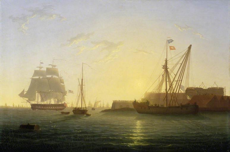 | Keywords: Arrival of HMS Clyde.jpg en HMS 'Clyde' Arriving at Sheerness After the 'Nore' Mutiny 30 May 1797 The 'Clyde' is shown arriving at sunrise in the Medway off Sheerness Dockyard She is in the left middle distance in port-bow view on the starboard tack flying a white ensign but with a red one hanging over her port quarter rail as a signal Nearer centre left is a cutter in starboard-bow view moored to a buoy and with a boat under her stern In the left foreground is a large mooring buoy On the right of the picture against the rising sun is a sheer hulk used for masting or de-masting ships shown in bow and starboard-broadside view with people waving to the 'Clyde' in her stern Beyond the hulk is part of Sheerness Dockyard with buildings a ship on the stocks and a crowd of people waving on the fortifications In the distance to the north-east ships of the mutinous fleet lie at anchor The painting is one of two commemorating the Clyde's escape from the Nore under her captain Charles Cunningham The first depicts the daring night time escape 1830 http //artuk org/discover/artworks/hms-clyde-arriving-at-sheerness-after-the-nore-mutiny-30-may-1797-174871 Creator William Joy thumb left Joy's first painting showing the Clyde sailing out of the Nore PD-old-100 30 May 1797 Paintings in the National Maritime Museum London Sailing ships of the Royal Navy Sheer hulks Sheerness William Joy |