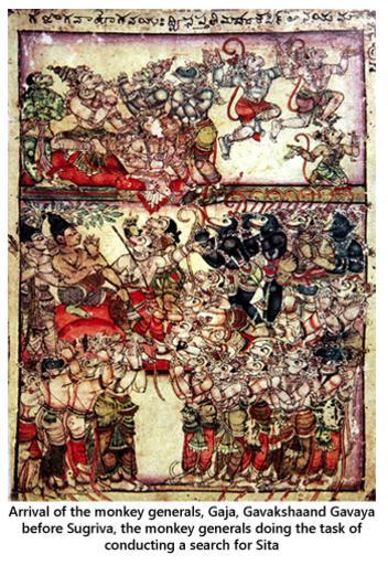 | Keywords: Arrival of monkey gaja, gavayu, generals before sugriva the monkey general doing the task of conducting a search of sita.png  of plates a glossary and the map along with illustrations of murals and paintings for a full understanding of the formation of the style of painting in the Ramayana manuscript completes the reader's experience of the discovery 17th - 18th Century http //www artnewsnviews com/view-article php article discovery-andhra-paintings-of-the-ramayana iid 21 articleid 530 Andhra Paintings of the Ramayana PD-Art Uploaded with UploadWizard Paintings of Ramayana Paintings from Andhra Pradesh Collections of the YSR State Archaeology Museum Vanara Small images Hindu folk deities |
