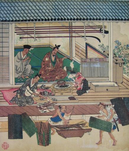 | Keywords: Arrow maker00.jpg 矢師 職人尽図屏風 ( 多院蔵)より 狩野吉信筆 桃山文化 <br />Arrow maker Ya-shi From Shokunin Zukusi-zu Byoubu Kita shrine collection From http //www bukyukai hu/galery_en html here late 15th - early 16th century 狩野吉信 Yoshinobu Kano PD-Art Bow and arrow in art Ya Historic samurai prints History of Japan Archery in Japan Paintings of the Azuchi Momoyama period Paintings on screens from Japan |