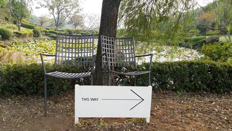 Keywords: arrow signs bench pause jeju island wood nature walk water