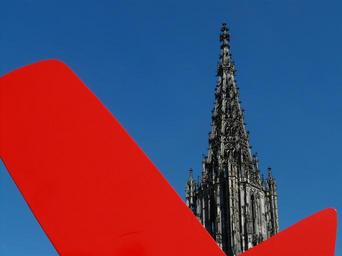 Keywords: art artwork keith haring red dog ulm ulm cathedral münster church steeple building architecture sky blue red