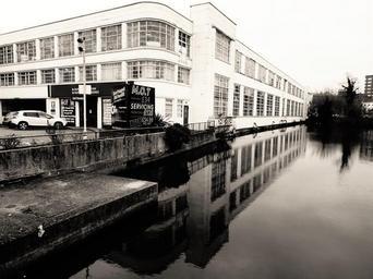 Keywords: monochrome outdoor The former Hillman Car Factory Maidstone Kent England. A reflection in the Mill Pond River Len. The former Hillman Car Factory Maidstone Kent England. A reflection in the Mill Pond River Len.