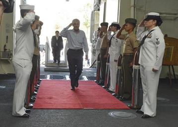 | Keywords: ASEAN meeting 140402-N-QF605-005.jpg en U S Defense Secretary Chuck Hagel center arrives on the amphibious transport dock ship USS Anchorage for a ship tour with defense ministers with the Association of Southeast Asian Nations in Pearl Harbor Hawaii April 2 2014 Hagel and the ASEAN minsters toured the Anchorage's medical facilities discussed maritime domain awareness and security cooperation and watched Marine Corps MV-22 Osprey tiltrotor aircraft operations from the flight deck 2013-08-09 LPD 23 https //www dvidshub net/image/1226695 140402-N-QF605-005 2014-04-05 10 04 PEARL HARBOR DC US PD-USGov-Military-Navy Chuck Hagel MV-22B Osprey Images from DoD uploaded by Fæ |