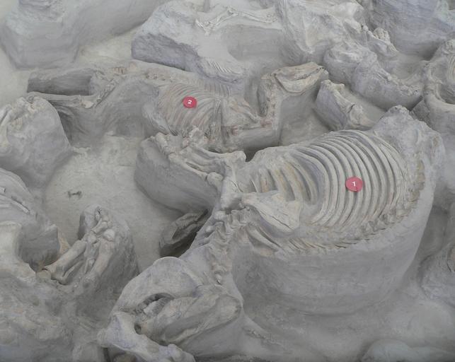 | Keywords: Ashfall Fossil Beds - Teleoceras and Cormohipparion.jpg en Ashfall Fossil Beds in Antelope County Nebraska According to nearby signs the 1 marker is on a young adult Teleoceras major nicknamed Tusker ; its estimated age is 8-9 years with wisdom teeth beginning to come in; the femur across its face near the bottom of the photo was probably taken from a neighboring carcass by a large predator The 2 marker is on the remains of a three-toed horse Cormohipparion occidentale 2012-09-09 14 26 00 own Ammodramus cc-zero Pictures by Ammodramus Taken with Panasonic Lumix DMC-FZ20 Ashfall Fossil Beds Uploaded with UploadWizard Teleoceras Equidae fossils |