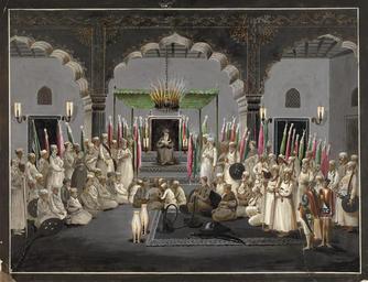 | Keywords: Asif muharram 1795 1.jpg Watercolour of the Muharram Festival part of the Hyde collection by an unknown artist working in the Murshidabad style c 1795 Inscribed on the back in pencil 'The Nubob of Moorshedd - at Prayers'; in ink 'The Nawaub of Morshedabad at Prayers a Night Scene ' Asaf al-Daula Nawab of Awadh from 1775 to1797 ordered the construction of the Great Imambara in 1784 for the purpose of celebrating the Muslim festival of Muharram The Muharram festival is in commemoration of the imams Ali Hasan and Hussein This festival starts on the 1st day of Muharram the first month of the Islamic calendar and lasts for 10 days In this view the Nawab is shown listening to the 'maulvi' reading from the scriptures in the hall of the Imanbara Subsequently the building was used as a mausoleum for Asaf ud-Daula upon his death in 1797 Anonymous http //www bl uk/onlinegallery/onlineex/apac/addorimss/t/019addor0003230u00000000 html British Library watercolour 2008-10-22 Anonymous-EU Historical images of Lucknow 1795 in India Asaf-ud-Daula Mourning of Muharram History of Uttar Pradesh 1790s paintings from India Governors of the Mughal Empire 1790s watercolor paintings People with flags in art |