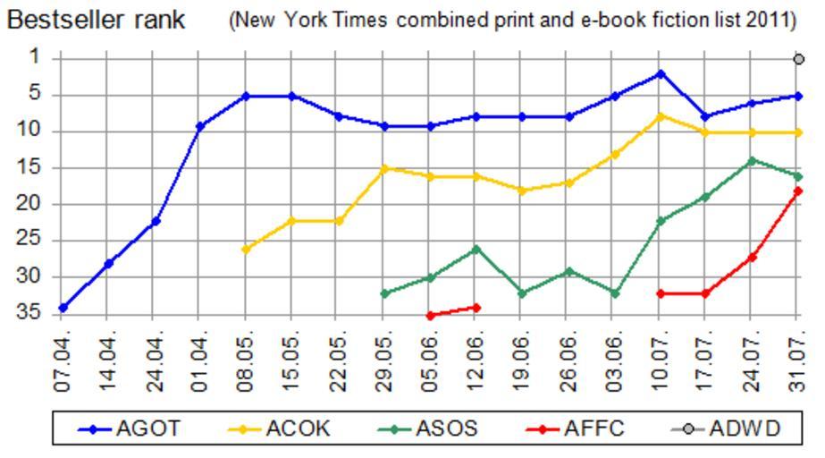 Keywords: ASOIAF 2011 NYT Bestseller List.png New York Times Best Sellers List - Weekly Graphic for A Song of Ice and Fire from April 7 2011 airing of the Game of Thrones pilot episode through July 31 2011 publication of A Dance With Dragons Redrawn in Excel with data from http //www nytimes com/interactive/2011/07/31/books/review/bestsellers-weekly-graphic html http //www webcitation org/69LnJoQXk Webcite 2012-02-05 Sgeureka en wikipedia Sgeureka A Song of Ice and Fire |