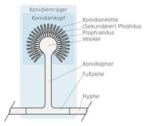 Keywords: Aspergillus-de.svg de Aspergillus-Sporenträger Aspergillus spore carrier own Benedikt Seidl 2010-03-30 Translation possible Aspergillus Fungus diagrams