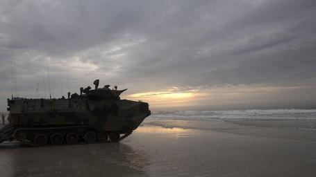 Keywords: Assault amphibious vehicles sit silently Onslow Beach silhouette