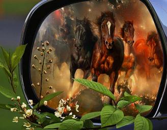 Keywords: assembly rearview mirror car mirror side mirror car mirror image abstraction hint virtuoso technique and great reflections the addition of horses tabun majka green leaves sztafaż the second plan