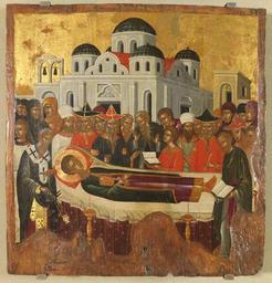 | Keywords: Assumption of St. Demetrios (Candia, 15th c.).jpg Η Κοίμηση του Αγίου Δημητρίου δεύτερο μισό του 15ου αιώνα 54x56εκ άγνωστος ζωγράφος του Χάνδακα Στην εικόνα αυτή αριστάνονται ο άγιος Δημήτριος νεκρός σε ολυτελή κλίνη και γύρω του τα ρόσω α ου αρευρίσκονται στη νεκρώσιμη ακολουθία αριστερά ένας ε ίσκο ος ου θυμιατίζει και ένας νεαρός διάκος και δεξιά ο ιερέας με ανοιχτό βιβλίο Πίσω α ό την κλίνη υ άρχουν οι ψάλτες με τα κωνικά τους κα έλα ρήτορες με λευκά τουρμ άνια μοναχοί μοναχές και ιστοί ου ενθούν Στο βάθος εικονίζεται μεγάλη εκκλησία ου είναι αφιερωμένη στον άγιο Δημήτριο ό ως υ οδηλώνει και το ανάγλυφο με την ροτομή του ε άνω α ό την όρτα της εισόδου http //eib xanthi ilsp gr/gr/icons asp second half of the 15th century unknown painter of Candia Icons of Dormition of Virgin Mary Files uploaded by Shakko from various sources PD-old 15th-century icons of Byzantine Empire Icons of Saint Demetrius Icons of Candia |