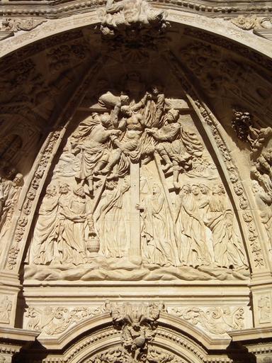 Keywords: Astorga Catedral de Santa María (01).JPG Detail on the tympanum of the main portal of the Catedral de Santa María Astorga León Spain Own Mattana 2010-11-23 Images by Mattana-Astorga Spain Cathedral of Astorga main facade Sculptures of the descent from the cross