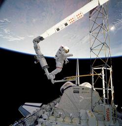 Keywords: astronaut spacewalk iss tools suit pack tether floating international space station job maintenance extravehicular activity