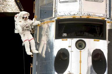 Keywords: astronaut spacewalk space shuttle hubble tools suit pack tether floating job maintenance extravehicular activity