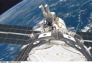Keywords: astronaut spacewalk space shuttle tools suit pack tether floating job maintenance extravehicular activity balance equipment earth space cosmos space station