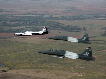 | Keywords: AT-38Bs T-37B SheppardAFB 2001.jpeg en Two U S Air Force Northrop AT-38B Talon aircraft and a USAF Cessna T-37B Tweet aircraft assigned to the 88th and 89th Fighter Training Squadrons 80th Tactical Fighter Wing Air Education and Training Command fly a three ship formation over Sheppard Air Force Base Texas USA to mark the 20th anniversary of the European North Atlantic Treaty Organization Joint Jet Pilot Training ENJJPT School on 20 October 2001 U S Defenseimagery mil photo no 011020-F-6184S-028 2001-10-20 Photographer's Name Tom Steele CIV USAF PD-USGov Northrop T-38 Talon Cessna T-37 United States Air Force 2001 photographs 80th Flying Training Wing United States Air Force |