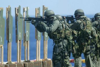 | Keywords: US Navy 020924-N-8590G-004 U.S. Marines from the 31st Marine Expeditionary Unit (MEU), take aim at their targets on the aft aircraft elevator of the Essex.jpg en At sea aboard USS Essex LHD 2 Sep 24 2002 -- U S Marines from the 31st Marine Expeditionary Unit MEU take aim at their targets on the aft aircraft elevator of the Essex The Marines are conducting shooting exercises while embarked aboard Essex to maintain their marksmanship and to be prepared for any possible amphibious mission Essex is underway with the 31st Marine Expeditionary Unit MEU participating in a Special Operations Capable Exercise SOCEX SOCEX is designed to certify that Special Operations Capable Teams are capable of executing several diverse missions from humanitarian assistance and disaster relief efforts to full-scale combat operation U S Navy photo by Photographer's Mate 3rd Class Gary B Granger RELEASED 2002-09-24 020924-N-8590G-004 Navy http //www navy mil/view_image asp id 2810 U S Navy photo by Photographer's Mate 3rd Class Gary B Granger PD-USGov-Military-Navy Aboard USS Essex LHD-2 |
