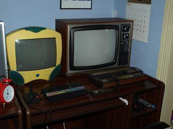 | Keywords: Atari 2600jr and Intellivision.jpg en This picture shows two popular retro video game consoles the Atari 2600jr and the Intellivision Both are in very mediocre condition 2011-04-25 own Matthew Paul Argall cc-zero Uploaded with UploadWizard Atari 2600 Intellivision |