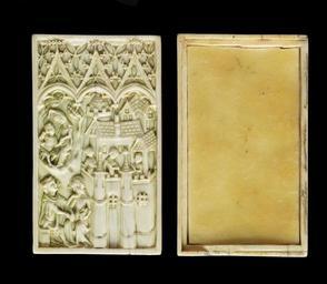 | Keywords: Atelier of the Boxes - Writing Tablet and Lid - Walters 71283 - View B.jpg During the Middle Ages paper and parchment were expensive and many people took advantage of less permanent forms of written communication One side of an ivory tablet was coated with wax; then a message was incised in the wax with a stylus which looks like a large pin and protected by an ivory lid The little box would be sent to the recipient who smoothed the wax and responded The sliding cover depicts three ladies in the town looking over its walls at two embracing couples seen to the left The bottom of the box shows the same town at greater distance a tent with two more lovers a hawking expedition and a hermit reading outside his rustic cell Several writing boxes are known from the same otherwise unidentified workshop between 1340 1360 Medieval ivory H 3 11/16 x W 2 1/8 x D of tablet and lid together 7/16 in 9 3 x 5 4 x 1 1 cm accession number 71 283 9704 Sale Cologne December 14 1893 no 92 Marcus Antocolsky Paris date and mode of acquisition unknown Marcus Antocolsky Sale Hotel Drouot Paris June 10 1901 no 73 George Robinson Harding London date and mode of acquisition unknown Henry Walters Baltimore June 15 1901 by purchase Walters Art Museum Henry Walters Acquired by Henry Walters 1901 The International Style The Arts in Europe Around 1400 The Walters Art Gallery Baltimore 1962 Images of Love and Death in Late Medieval and Renaissance Art The University of Michigan Museum of Art Ann Arbor 1975-1976 The Medieval Garden Spencer Museum of Art Lawrence; Dumbarton Oaks Washington 1983 Images in Ivory Precious Objects of the Gothic Age The Detroit Institute of Arts Detroit; The Walters Art Gallery Baltimore 1997 place of origin north France Walters Art Museum license Medieval ivory in the Walters Art Museum Atelier of the Boxes Media contributed by the Walters Art Museum needs category review |