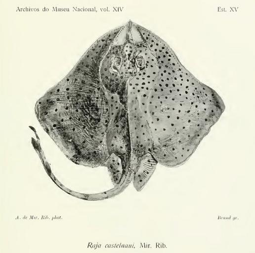 | Keywords: Atlantoraja castelnaui(MIRANDA RIBEIRO,1907).jpg ru Иллюст ация соп овождавшая пе вое научное описание вида 2015-11-27 Fauna Braziliense Peixes II Desmobranchios Archivos do Museu Nacional do Rio de Janeiro 14 131-217 Pls 1-20 A Miranda-Ribeiro 1907 other versions PD-old-70-1923 Uploaded with UploadWizard Atlantoraja castelnaui |