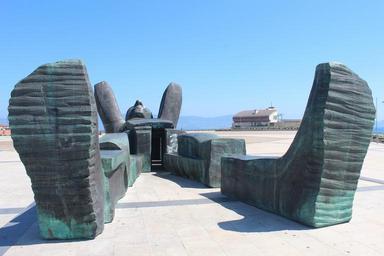 Keywords: atlas dreaming giant man lying on the ground statue port sculpture bronze saxanxo marina galicia district spain