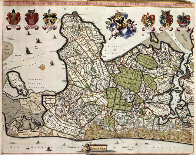 Keywords: Atlas Van der Hagen-KW1049B11 093-T HOOGH-HEEMRAETSCHAP VAN DE UYTWATERENDE SLUYSEN IN KENNEMERLANT ENDE WEST-FRIESLANTT.jpeg of the Atlas Van der Hagen in the catalogue of the KB http //opc4 kb nl/DB 1/TTL 1/LNG EN/PPN PPN 353012750 Johannes Dou Coenraet Decker Abraham Deur Author Johannes Dou Coenraet Decker Abraham Deur Publisher Onbekend / unknown Author Johannes Dou Coenraet Decker Abraham Deur Publisher Onbekend / unknown credit line 1682-1683 Deze kaart van het hoogheemraadschap van de Uitwaterende Sluizen in Kennemerland en West-Friesland werd in 1680 vervaardigd door de landmeter Johannes Dou 1642-1682 De graveur Coenraet Decker 1651-1685 graveerde het kaartbeeld terwijl Abraham Deur de letters sneed Deze kaart is een typisch voorbeeld van Nederlandse waterschapskartografie Om het in een diepe kom liggende Hollandse laagland tegen het water van zee en rivieren te beschermen lagen er in West-Nederland een groot aantal waterschappen die ieder verantwoordelijk waren voor de waterstaatszorg in hun gebied Om het waterbeheer zo efficient mogelijk te laten zijn waren goede overzichtskaarten enorm belangrijk Op deze kaarten werden vaak ook de wapenschilden van de bestuurders van het waterschap gegraveerd Dat representatieve karakter was vaak erg belangrijk Zo werd deze kaart van de Uitwaterende Sluizen in Kennemerland en West-Friesland in de loop van de 17de en 18de eeuw meerdere malen herdrukt Het kaartbeeld bleef daarbij ongewijzigd maar de wapens werden steeds veranderd Afgaande op de wapenschilden kunnen we vaststellen dat de kaart tussen 1682 en 1683 werd gepubliceerd The map of the district water board hoogheemraadschap Uitwaterende Sluizen in Kennemerland en Westfriesland was produced by surveyor Johannes Dou 1642-1682 in 1680 Coenraet Decker 1651-1685 engraved the image of the map with Abraham Deur cutting the letters This map is a typical example of the cartography of river maps In order to be able to protect the lower area in Holland against the sea and rivers there were several water boards in West-Netherlands reponsible for the management and care of the territory To achieve this accurate general maps were indispensible These maps were often decorated with the coats of arms of the representatives of the polder board The representative character was very important So much so that this map was reissued several times during the 17th and 18th centuries The image on the maps was not changed but the coats of arms were adapted Judging by these coats of arms we can determine that the map was published between 1682 and 1683 54 5 x 59 cm exhibition history Institution Koninklijke Bibliotheek kopergravure Technique copper engraving KW1049B11_093 - Volume 1 Information field Related persons Dou Johannes - Decker Coenraet - Deur Abraham Information field Depicted locations Westfriesland water board - Kennemerland water board - Netherlands object history object type Kaart Map PD-old-100 place of creation Amsterdam place of discovery Source page at the http //resolver kb nl/resolve urn urn gvn KONB01 231 Geheugen van Nederland / Memory of the Netherlands website Koninklijke Bibliotheek T HOOGH-HEEMRAETSCHAP VAN DE UYTWATERENDE SLUYSEN IN KENNEMERLANT ENDE WEST-FRIESLANTT Uploaded with GWToolset Atlas Van der Hagen-KW1049B11_093-T HOOGH-HEEMRAETSCHAP VAN DE UYTWATERENDE SLUYSEN IN KENNEMERLANT ENDE WEST-FRIESLANTT http //resolver kb nl/resolve urn urn gvn KONB01 1049B11_093 size large Atlas van der Hagen |