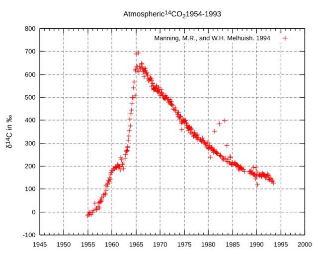 | Keywords: Atmospheric radiocarbon 1954-1993.svg An improved version of this plot is available as Image Radiocarbon bomb spike svg gnuplotted data of atmospheric radiocarbon in Wellington New Zealand 1954AD to 1993AD The SVG file from gnuplot has been improved manually ;Data source Manning M R and W H Melhuish 1994 Atmospheric 14C record from Wellington In Trends A Compendium of Data on Global Change Carbon Dioxide Information Analysis Center Oak Ridge National Laboratory U S Department of Energy Oak Ridge Tenn U S A ;URL http //gcmd gsfc nasa gov/records/GCMD_CDIAC_C14_WELLINGTON html http //cdiac esd ornl gov/trends/co2/welling htm All rights for generating the graphics shall be released As far as I know there is no copyright protection on measurement data in general Gnuplot diagrams Carbon-14 |