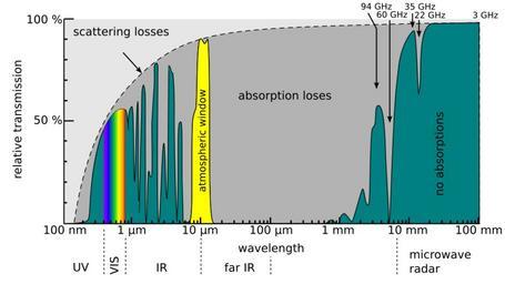 | Keywords: Atmospheric window EN.svg en Absorption spectrum during atmospheric transition of electromagnetic radiation An atmospheric transmission 'window' can be seen between 8-14 µm 700 - 1250 cm<sup>-1</sup> de Durchlässigkeit für elektromagnetische Wellen Absorption von eintreffender elektromagnetischer Strahlung beim Durchgang durch die Atmosphäre Das atmosphärische Fenster ist im Bereich 8-14 µm 700 - 1250 cm<sup>-1</sup> zu sehen own Cepheiden 2009-04-14 w de file Atmosphärische Durchlässigkeit DE svg PNG-Version Herbertweidner 19 22 31 Jan 2008 CET SVG-Umsetzung Cepheiden 18 05 25 Mär 2009 CET Atmosphärische Absorption fr svg IR atmospheric Atmospheric absorption spectra |