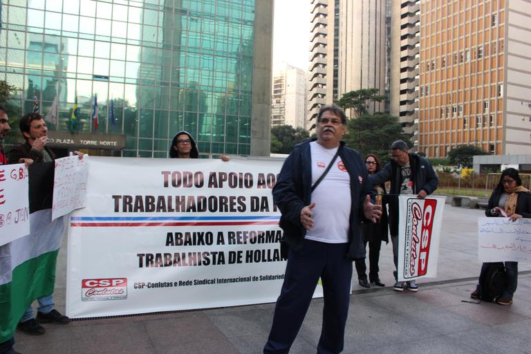 | Keywords: Ato realizado em frente ao consulado geral da França, em apoio aos trabalhadores franceses em luta contra a reforma nas leis trabalhistas. As intervenções também denunciaram perseguições e criminalização de ativistas de diversos países.