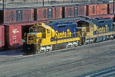 | Keywords: at&sf atsf santa fe santafe outdoor vehicle train railroad locomotive A Roger Puta Photograph Beau Minnick on Facebook commented, "Yes they are SD26s in the early 70s Santa Fe decided to rebuild their SD24 to bring them up to a more modern standard. This was a capital rebuilding program done at the San Bernardino shops from 73 to 78. The SD24 was never EMDs most reliable product, with Santa Fe having 80 of them rebuild made financial scene for the railroad. The rebuild included central air filtering upgraded electronics and new power assemblies which increased horsepower. They where all off the property by 1986. Some went to EMD as credit for GP50s and the rest went to the Gilford Railroad. None of them survive today." A Roger Puta Photograph Beau Minnick on Facebook commented, "Yes they are SD26s in the early 70s Santa Fe decided to rebuild their SD24 to bring them up to a more modern standard. This was a capital rebuilding program done at the San Bernardino shops from 73 to 78. The SD24 was never EMDs most reliable product, with Santa Fe having 80 of them rebuild made financial scene for the railroad. The rebuild included central air filtering upgraded electronics and new power assemblies which increased horsepower. They where all off the property by 1986. Some went to EMD as credit for GP50s and the rest went to the Gilford Railroad. None of them survive today." |