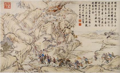 | Keywords: Attack on the mountain Xiaobantian.jpg en A scene of the Taiwanese campaign 1787-1788 zh-hans 平定台湾战役之 攻剿小半天山(今台湾南投县鹿谷乡內) http //www battle-of-qurman com cn/e/hist htm late XVIII century A collaboration between Chinese and European painters The Jesuit missionaries involved in producing the drawings in China were Giuseppe Castiglione Jean-Denis Attiret Ignace Sichelbart and Jean Damascene The engravings were executed in Paris under the direction of Charles-Nicolas Cochin of the Académie Royal at the Court of Louis XVI and the individual engravers include Le Bas Aliamet Prevot Saint-Aubin Masquelier Choffard and Launay PD-Art Military of Qing China History of Nantou Lugu Township Nantou Ten Great Campaigns Paintings of the Qing Dynasty |