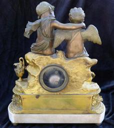 | Keywords: Exceptional – 19th Century Large Gilt Bronze Ormolu Louis XVI Style Cherub Mantle Clock – Aubert & Klaftenberger a Geneve, with two cherubs sitting drinking water from a shell on a serpentine shaped gilt bronze and white Carrara marble base, striking the hours and half hours on a bell, signed white enamel dial Aubert & Klaftenberger a Geneve.