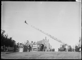 | Keywords: fire ladder fireladder fire department firedepartment fire brigade firebrigade firefighter firefighters blackandwhite monochrome outdoor photo border black and white The Auckland Fire Brigade at drill in Beresford Street using the 85 foot Simon's ladder. A fireman is sitting on the end of the ladder as it is being lowered to the ground. Other firemen and onlookers are standing on the street watching. Pitt Street Methodist Church is in the background. The construction site shed of J T Julian & Son, contractors, with a pile of rubble behind, can be seen in the middle foreground. Builders are working on the construction site to the left. Photograph taken by William A Price in 1912. Quantity: 1 b&w original negative(s). Physical Description: Dry plate glass negative 4.75 x 6.5 inches Auckland Fire Brigade at drill. Price, William Archer, 1866-1948 :Collection of post card negatives. Ref: 1/2-001832-G. Alexander Turnbull Library, Wellington, New Zealand. natlib.govt.nz/records/22787269 The Auckland Fire Brigade at drill in Beresford Street using the 85 foot Simon's ladder. A fireman is sitting on the end of the ladder as it is being lowered to the ground. Other firemen and onlookers are standing on the street watching. Pitt Street Methodist Church is in the background. The construction site shed of J T Julian & Son, contractors, with a pile of rubble behind, can be seen in the middle foreground. Builders are working on the construction site to the left. Photograph taken by William A Price in 1912. Quantity: 1 b&w original negative(s). Physical Description: Dry plate glass negative 4.75 x 6.5 inches Auckland Fire Brigade at drill. Price, William Archer, 1866-1948 :Collection of post card negatives. Ref: 1/2-001832-G. Alexander Turnbull Library, Wellington, New Zealand. natlib.govt.nz/records/22787269 |