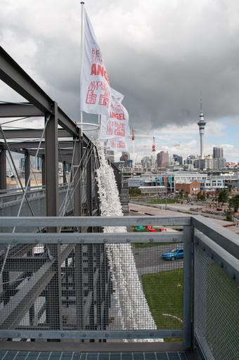 | Keywords: outdoor architecture building structure infrastructure building This is a small lookout at the top of the western staircase, with the actual walkway at left. The Sky Tower is prominent at right in the distance. Auckland City Mission flags fly from posts, and streamers reach from them to the ground. This is a small lookout at the top of the western staircase, with the actual walkway at left. The Sky Tower is prominent at right in the distance. Auckland City Mission flags fly from posts, and streamers reach from them to the ground. |