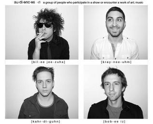 Keywords: Audiences.png en Audiences music Chicago own Audiences 2011-02-20 Cc-zero Musical groups from the United States Four people Musical quartets Black and white photographs Portrait photographs Men looking at viewer